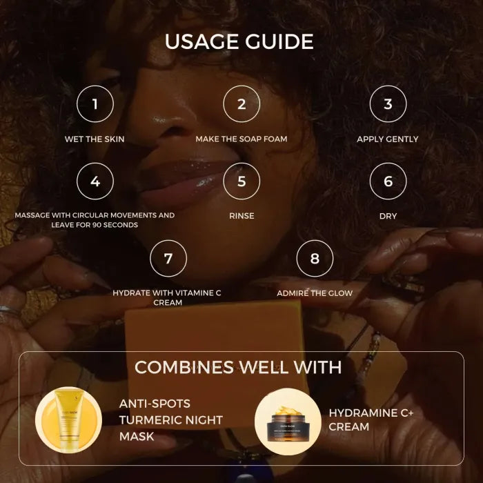 Wet the Turmibar and create a rich lather in your hands or directly on damp skin. Massage gently in circular motions across your face and body for 30-60 seconds, allowing the turmeric's active compounds to penetrate. Rinse thoroughly with warm water and pat dry to reveal softer, brighter skin after each use.